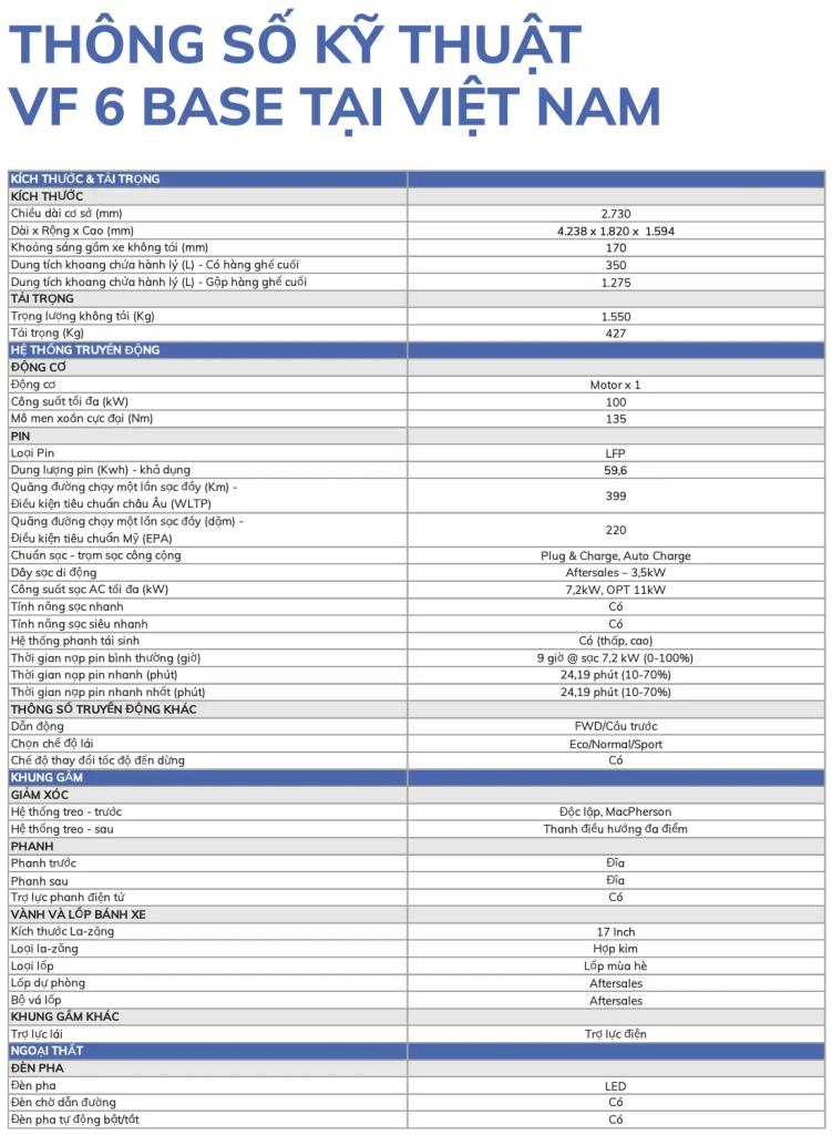 Cả hai phiên bản của VF 6 đều được trang bị pin LFP dung lượng 59,6 kW