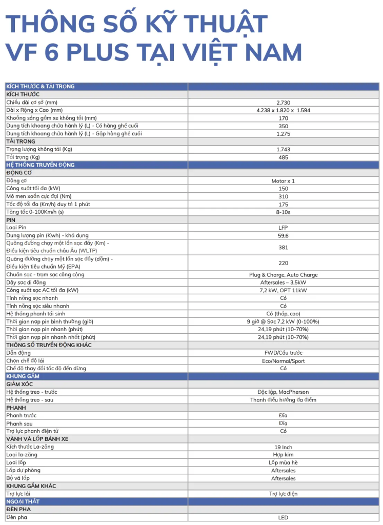 Cả hai phiên bản của VF 6 đều được trang bị pin LFP dung lượng 59,6 kW với phạm vi hoạt động tương ứng là 399 km và 381 km (theo tiêu chuẩn WLTP) cho một lần sạc đầy. Xe sử dụng động cơ điện có công suất tối đa 100 kW và 150 kW, tương ứng với mô-men xoắn cực đại 135 Nm và 310 Nm, cho cảm giác lái hứng khởi và dễ dàng đáp ứng nhu cầu di chuyển của mọi khách hàng.