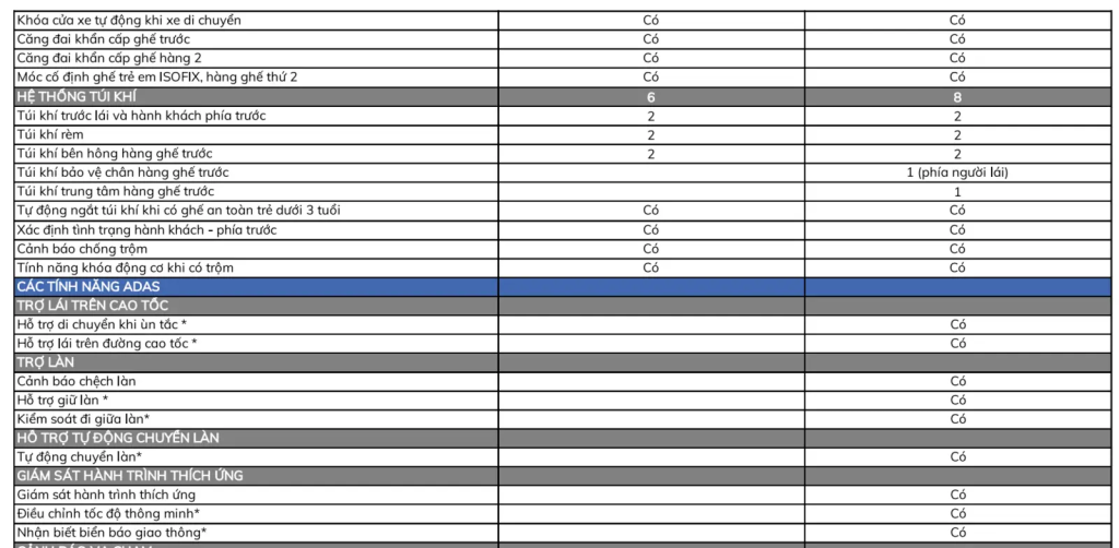 Tính năng an toàn trên VinFast VF7 đều đáp ứng đủ tiêu chuẩn 5 sao của Euro NCAP, NHTSA và ASEAN NCAP. Xe được trang bị tới 11 túi khí cùng gói công nghệ hỗ trợ lái nâng cao, hỗ trợ di chuyển khi tắc đường, hỗ trợ lái đường cao tốc, tự động chuyển làn, hỗ trợ đỗ xe an toàn phần, triệu tập xe thông minh.