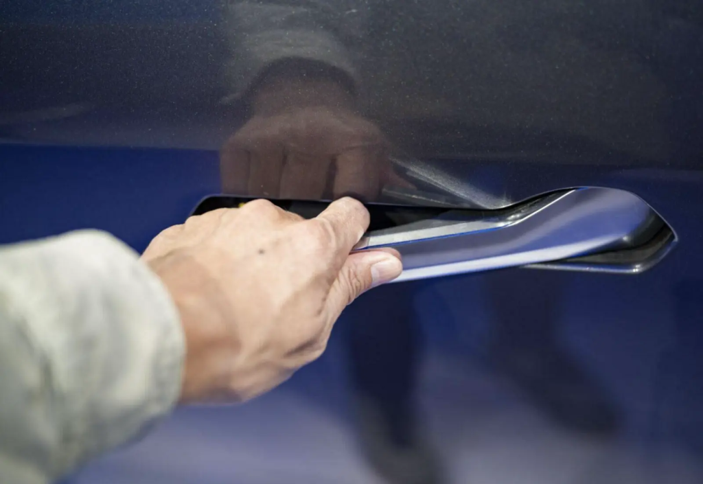 Tay nắm ẩn trong thân xe, tạo ra sự liền mạch cho không khí đi qua. Mở cửa với thao tác ấn và kéo mang lại trải nghiệm mới lạ, khác biệt với tay nắm cửa truyền thống.